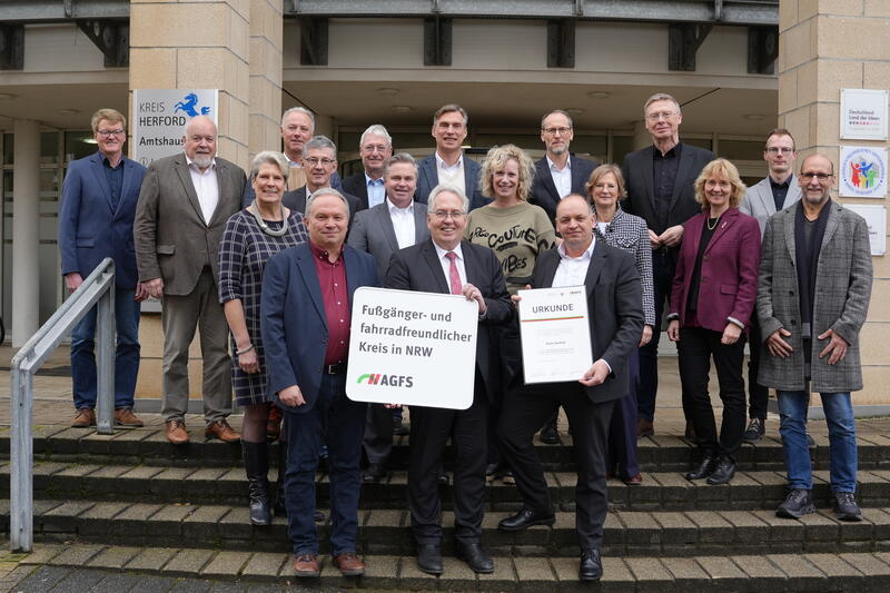 Der Kreis Herford ist das 116. Mitglied der Arbeitsgemeinschaft fußgänger- und fahrradfreundlicher Städte, Gemeinden und Kreise in Nordrhein-Westfalen e. V. (AGFS NRW). Landrat Jürgen Müller nahm am 14. Februar 2025 die Mitgliedsurkunde von Viktor Haase, Staatssekretär des Umwelt- und Verkehrsministeriums, und Wolfram Mischer vom AGFS NRW, entgegen.